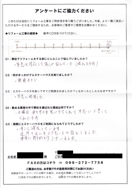 見積りについては早く対応していただいた。工事についてはよい説明と設置も早かった。取り付けも丁寧に感じた。設置後の保証書等の送付も早かったと思う。