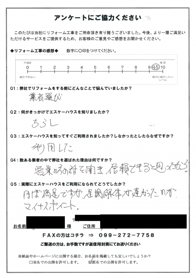 お客様の声|工事後のアンケート Q1:弊社でリフォームをする前にどのようなことに悩まれていましたか? 業者選択 Q2:何がきっかけでエスケーハウスを知りましたか? ちらし Q3:エスエーハウスを知ってすぐ利用されましたか?しなかったとしたらなぜですか? 利用した Q4:数ある業者の中で弊社を選ばれた理由は何ですか? 営業の方の話を聞き、信頼できると思ったから Q5:実際にエスケーハウスをご利用になられてどうでしたか? ほぼ満足ですが、足場の解体が遅かったのがマイナスポイント 鹿児島市 匿名希望