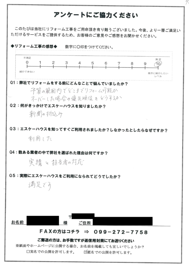 お客様の声|工事後のアンケート Q1:弊社でリフォームをする前にどんなことでなやんでいましたか? 予算の範囲内でどこまでリフォーム可能か オーバーした場合の優先順位はどうするか Q2:何がきっかけでエスケーハウスを知りましたか? 新聞の折り込み Q3:エスケーハウスを知ってすぐご利用されましたか? しなかったとしたらなぜですか? 利用した Q4:数ある業者の中で弊社を選ばれた理由は何ですか? 実績と担当者の対応 Q5:実際にエスケーハウスをご利用になられてどうでしたか? 満足です。 日置市 匿名希望様